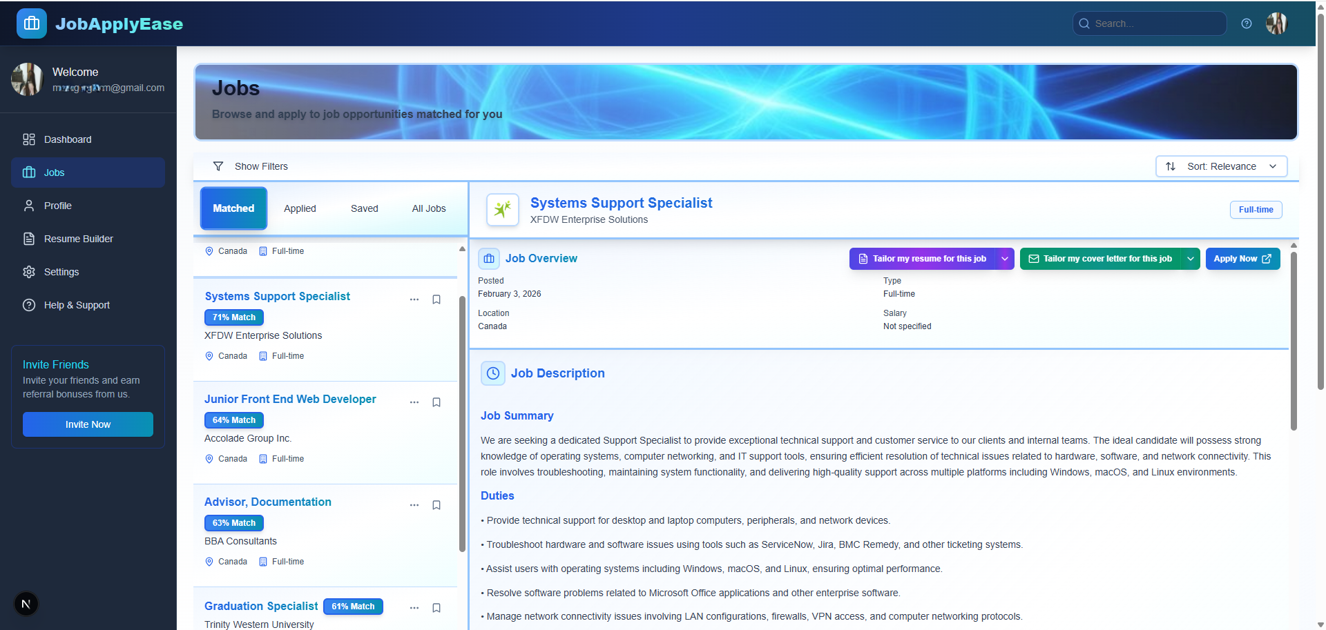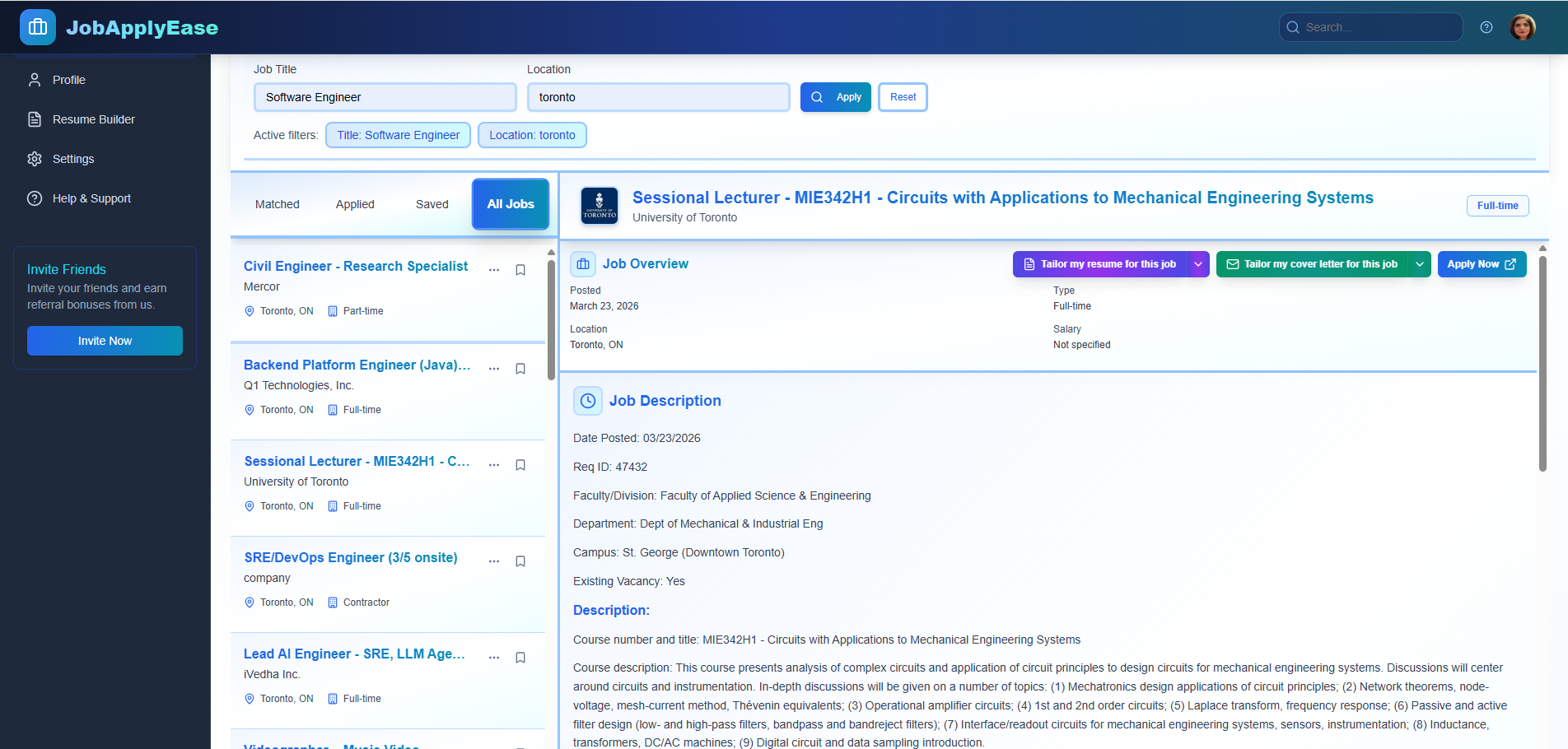 JobApplyEase uses AI to find matched jobs and tailor your resume and cover letter for each job match. With one click, you can apply to multiple jobs saving you time and effort.
